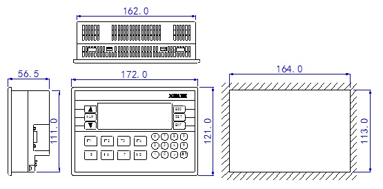 一般說明 顯示類型黃綠色STN使用壽命20000小時以上,環境溫度25℃,24小時運行顯示區域192*64亮度電位器可調文字設定中文簡體/繁體、英文(24字符×4行,即12漢字×4行)字符大小點陣字體、矢量字體按鍵26個存儲器畫面64KB FlashROM數據1KB SRAM接口下載口RS232通訊口OP330:RS232/RS422;OP330-S:RS232/RS485 功能說明 電氣特征輸入電壓DC24V電壓范圍DC22V~DC26V消耗電流小于140mA允許失電10ms以下(實際失電小于1s)抗電壓沖擊AC1000V,10mA,小于1分鐘(信號與地間)絕緣電阻DC500V,10MΩ以上(信號與地間)環境運行溫度0℃~50℃存儲溫度-20℃~60℃運行濕度10%RH~90%RH(無凝露)抗干擾能力干擾電壓:1500Vp-p 脈沖周期:1us 持續時間:1分鐘空氣無腐蝕性氣體結構冷卻方式自然風冷保護等級前面板符合IP65外部尺寸(mm)172.0*121.0*56.5面板開孔尺寸(mm)164.0*113.0 產品外形及尺寸(單位:mm)