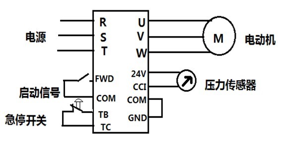 1、變頻改造的原理分析。將主管出口壓力作為調節參數,通過壓力變送器將主管出口壓力信號,轉換為4—20mA直流信號(或0—10v直流電壓信號),送入變頻器PID調節器,與壓力設定值比較,其差值由調節器作PI運算,輸出信號送給控制系統,隨時調整變頻器的輸出頻率,控制電機轉速,改變泵的排氣量,維持主管出口壓力穩定在設定的壓力值上;若主管壓力增加時,將自動進行調節。