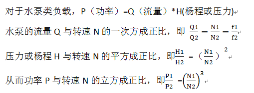 如果水泵的效率一定,當(dāng)要求調(diào)節(jié)流量下降時,轉(zhuǎn)速N可以成比例的下降,而此時電機輸出功率P也成立方關(guān)系下降。即水泵電機的功率與轉(zhuǎn)速近似成立方比的關(guān)系。因而,當(dāng)變頻器調(diào)節(jié)水泵轉(zhuǎn)速,使得電機轉(zhuǎn)速下降的過程中節(jié)能效果是非常顯著的。