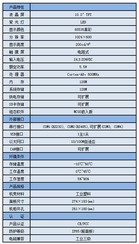 TPC1061Ti,是一套以先進的Cortex-A8 CPU為核心(主頻600MHz)的高性能嵌入式一體化觸摸屏。該產(chǎn)品設(shè)計采用了10.2英寸高亮度TFT液晶顯示屏(分辨率1024×600),四線電阻式觸摸屏(分辨率4096×4096)。同時還預裝了MCGS嵌入式組態(tài)軟件(運行版),具備強大的圖像顯示和數(shù)據(jù)處理功能。