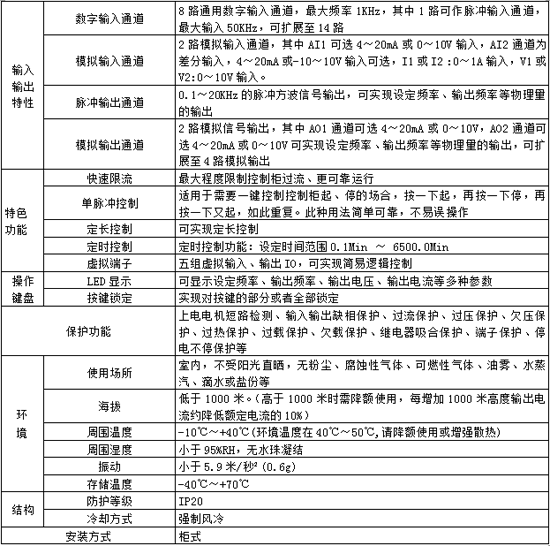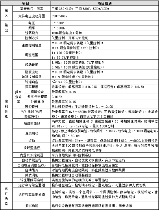 1、先進的磁通矢量控制技術,速度響應快,低頻力矩大,過載能力強;
